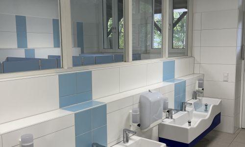 Die neue Heizungsanlage besteht aus einer Wärmepumpe, die Ihren Strombedarf größtenteils aus dem selbst erzeugten Strom mit Batteriespeicher bezieht. Die Sanitärleitungen wurden erneuert und zur Vermeidung von Legionellenbildung wird das Wasser direkt an den Waschbecken erwärmt. Die Toiletten- und Sanitäranlagen wurden ebenfalls auf einen kindgerechten neuen Stand gebracht. Die Küche erhielt ebenfalls ein Update.