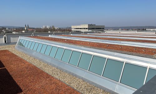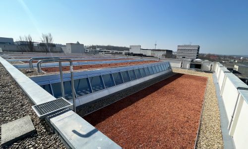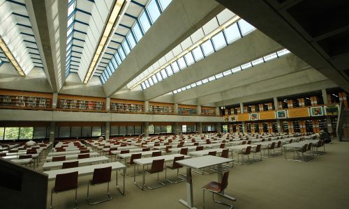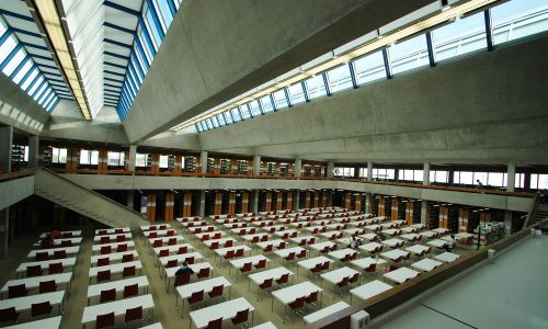 Bei diesem Pilotprojekt musste, in Zusammenarbeit mit dem Ing.-Büro Dr. Sixdorf, die vorgespannte Stahlbetonträgerkonstruktion des Daches, aufgrund von Wassereintritt an den tragenden Teilen, saniert und statisch verstärkt werden. In diesem Zusammenhang wurden auch die gesamten Dächer der beiden Bibliotheken energetisch saniert, sowie die gesamte Entwässerungssituation mit einer Unterdruckentwässerung abgeändert. Die ganze Baumassnahme fand während des laufenden Betriebes statt.