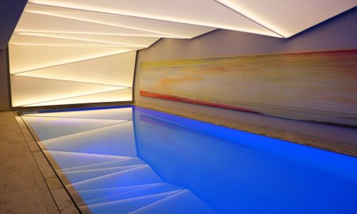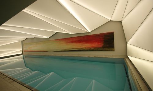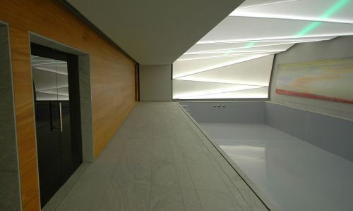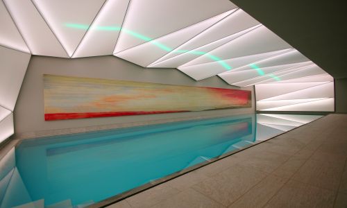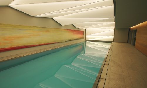 Bei diesem Innenpool wurde das darüber stehende, denkmalgeschütze Gebäude über zwei Stockwerke unterfangen und der Pool in Einzelteilen eingebracht und zusammengesetzt. Die architektonische Planung des Architekten Oliver Benke (†) war Grundlage für das ganze Innenraumdesign der Bozener Innenarchitektin Frau Sabine Settari, das den Charakter eines riesigen Bergkristalls wiederspiegelt. Der Naturstein am Boden und die Wandvertäfelung wurden dazu passend ausgewählt. Das Wandgemälde schuf Peter Lang aus Gleissenberg. In dieses Bauprojekt bin ich während der laufenden Baumassnahme eingestiegen. Ich habe den Schwimmbadbereich für die Architektengemeinschaft Benke & Unglaub fertig gestellt.