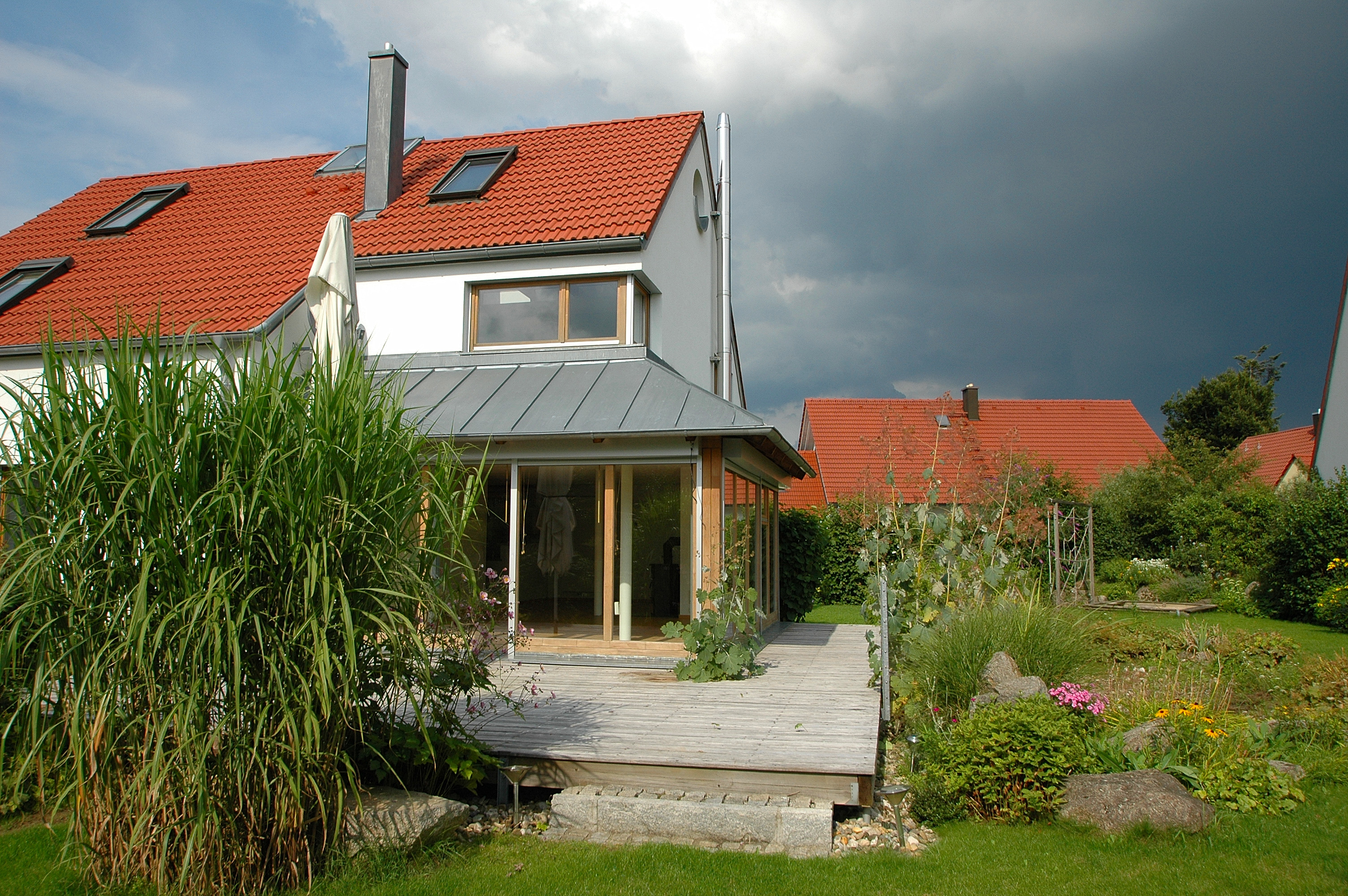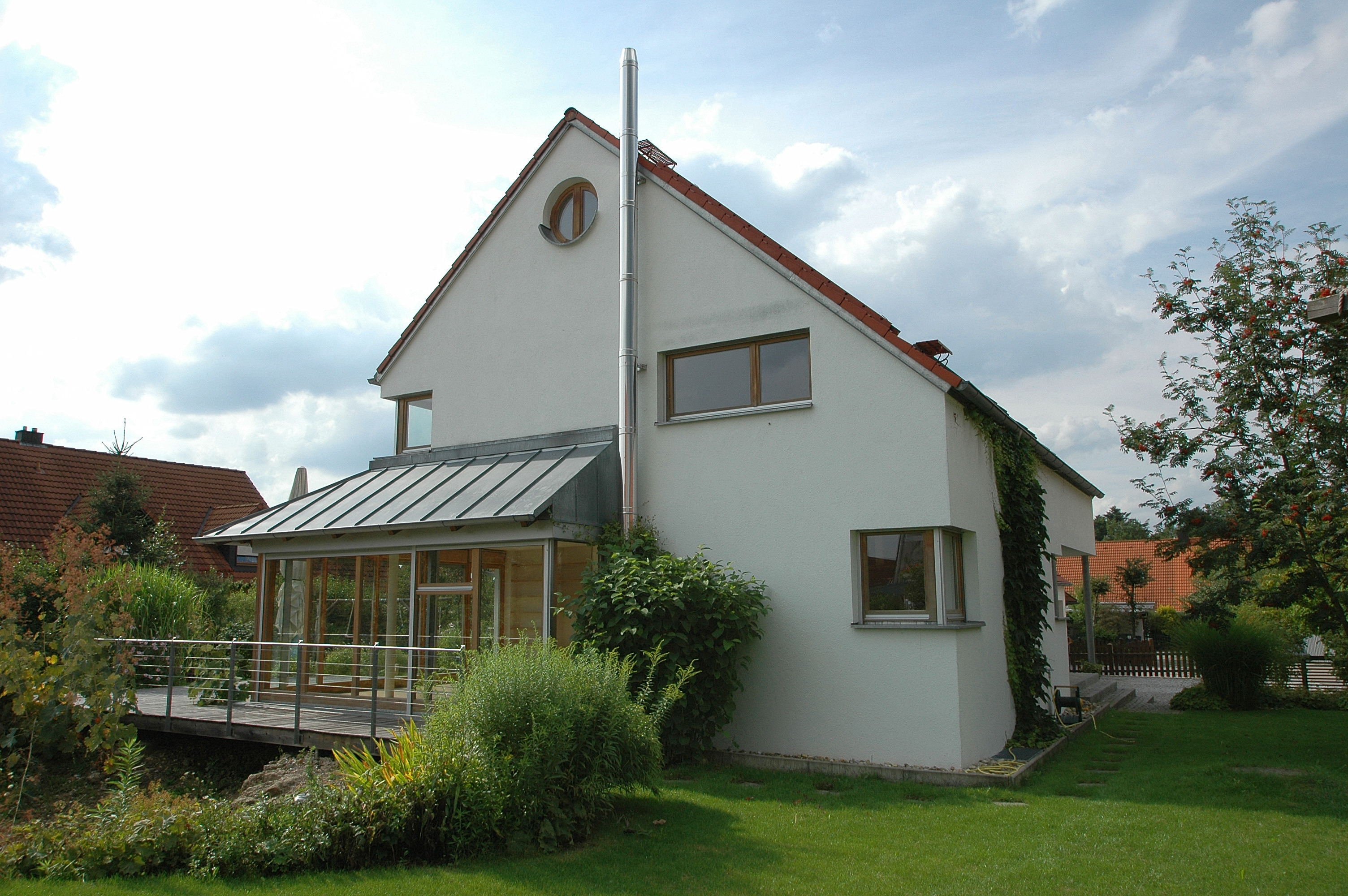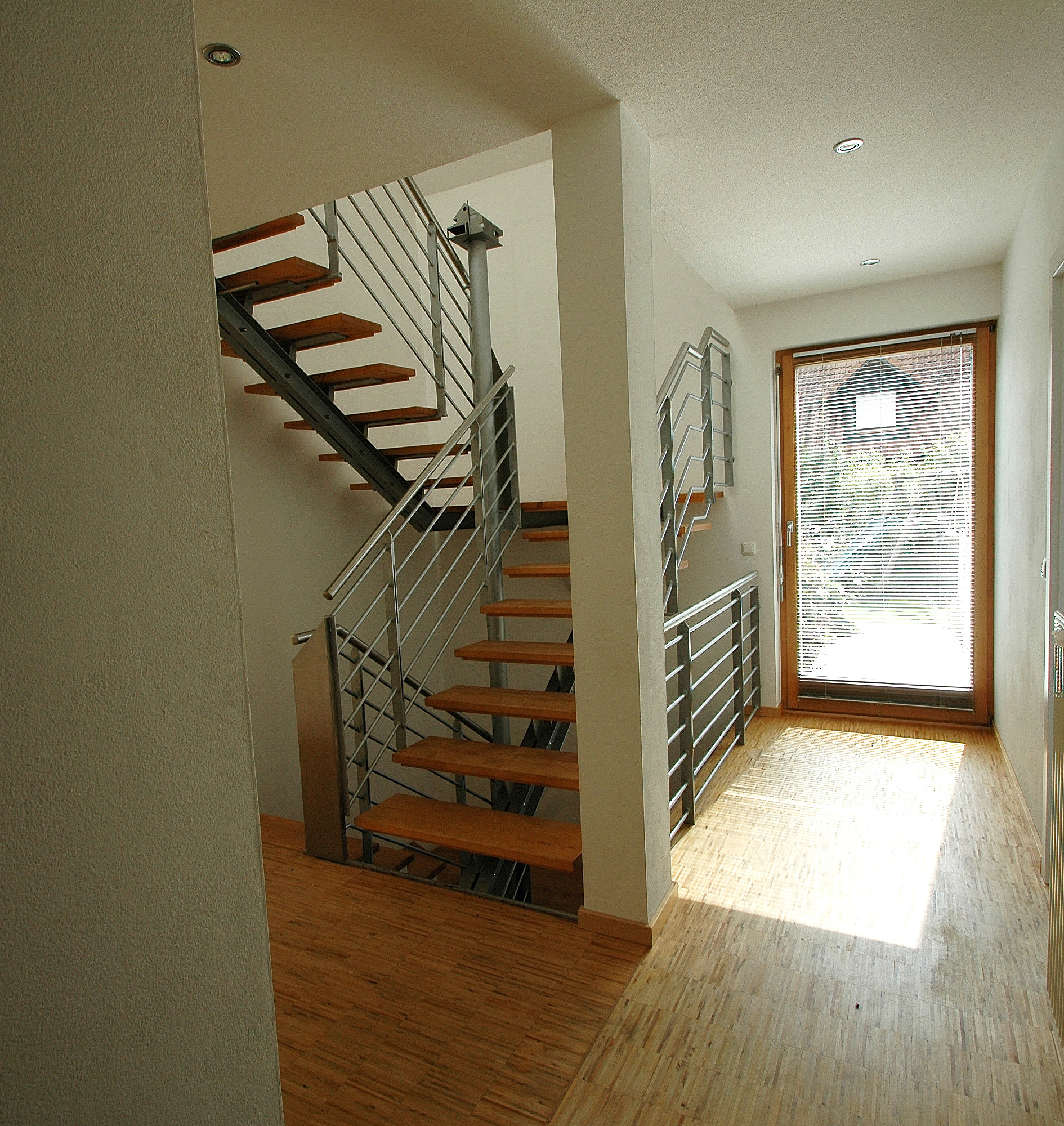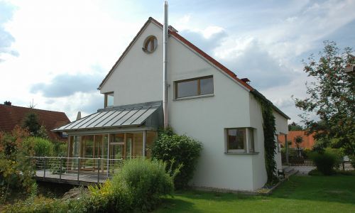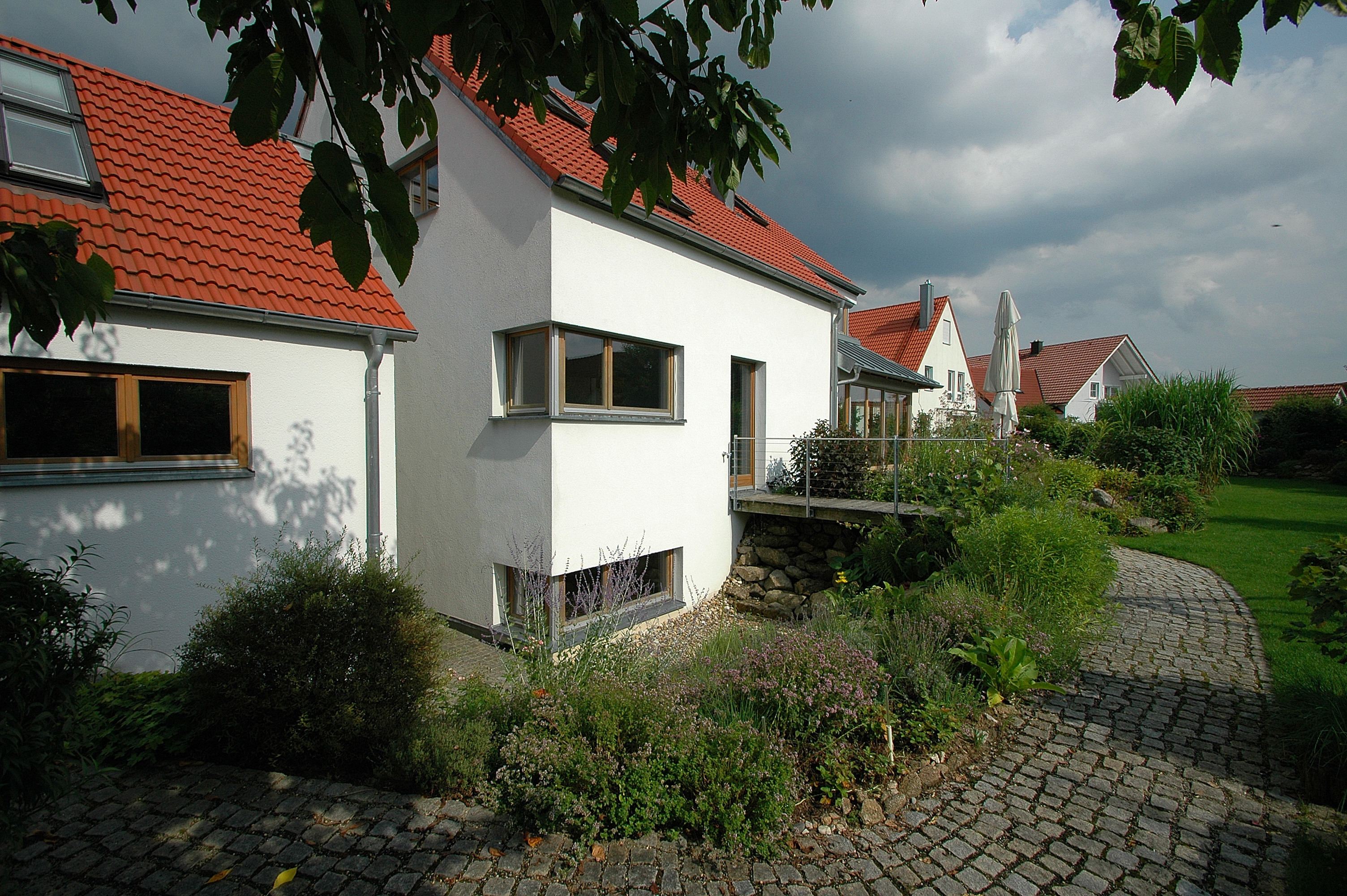 Dieses Einfamilienhaus wurde in einem Gebiet mit strengem Bebauungsplan gebaut. Da für dieses Haus bereits eine andere Planung von mir, für andere Bauherren existierte, bei der auch die Bodenplatte schon gegossen war, musste auf die vorhandenen Abmessungen Rücksicht genommen werden. Das Haus zeichnet sich durch seine klaren Grundriss und seine klaren Linien aus. Das Wohnzimmer ist nach Südwesten orientiert und in diese Richtung auch entsprechend aufgeglast.