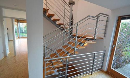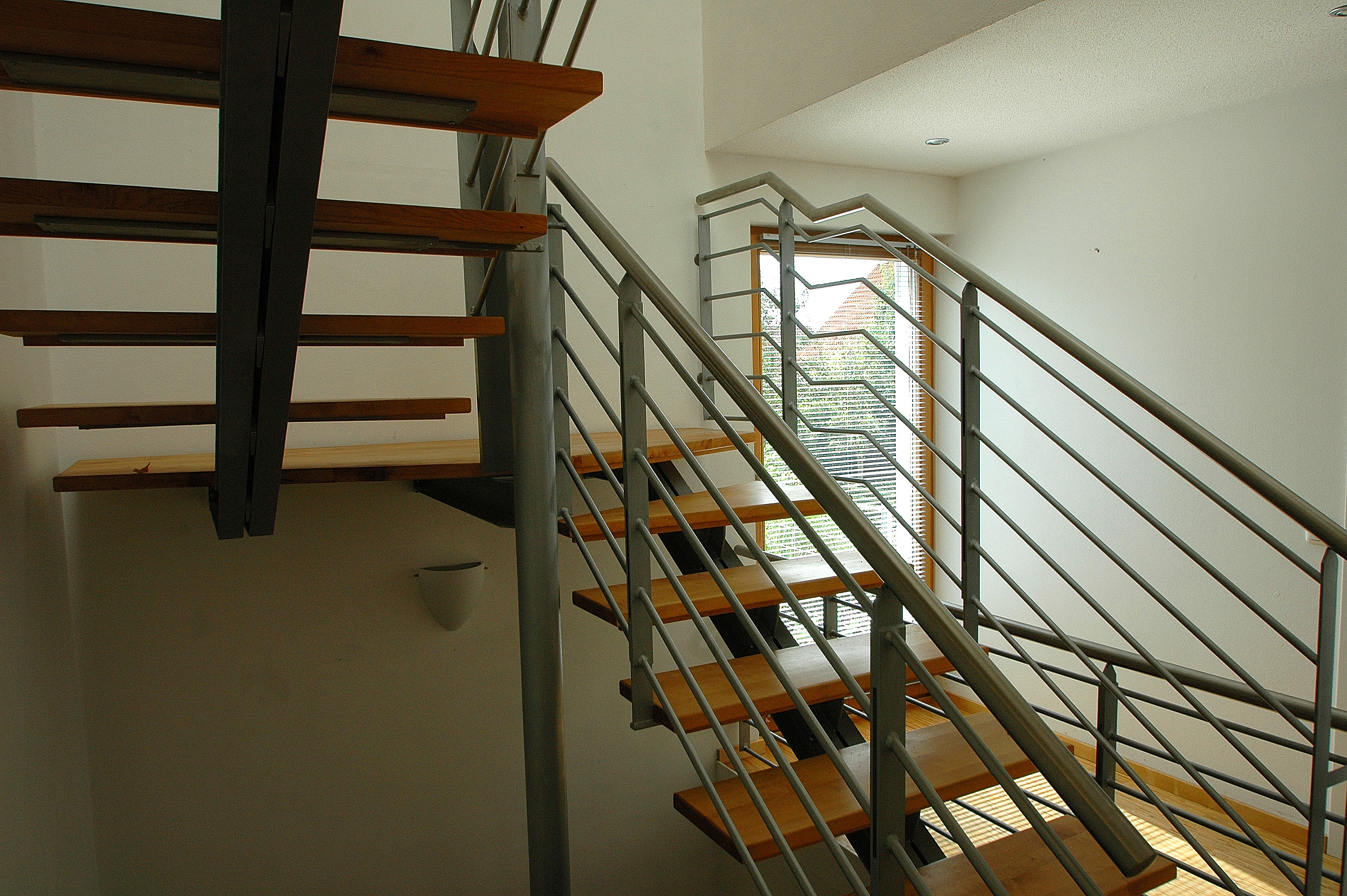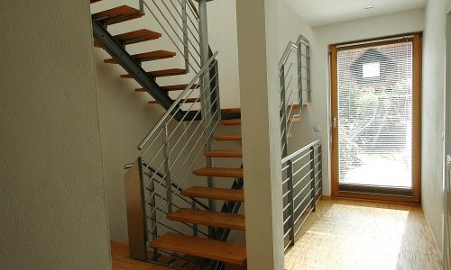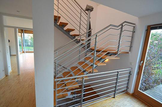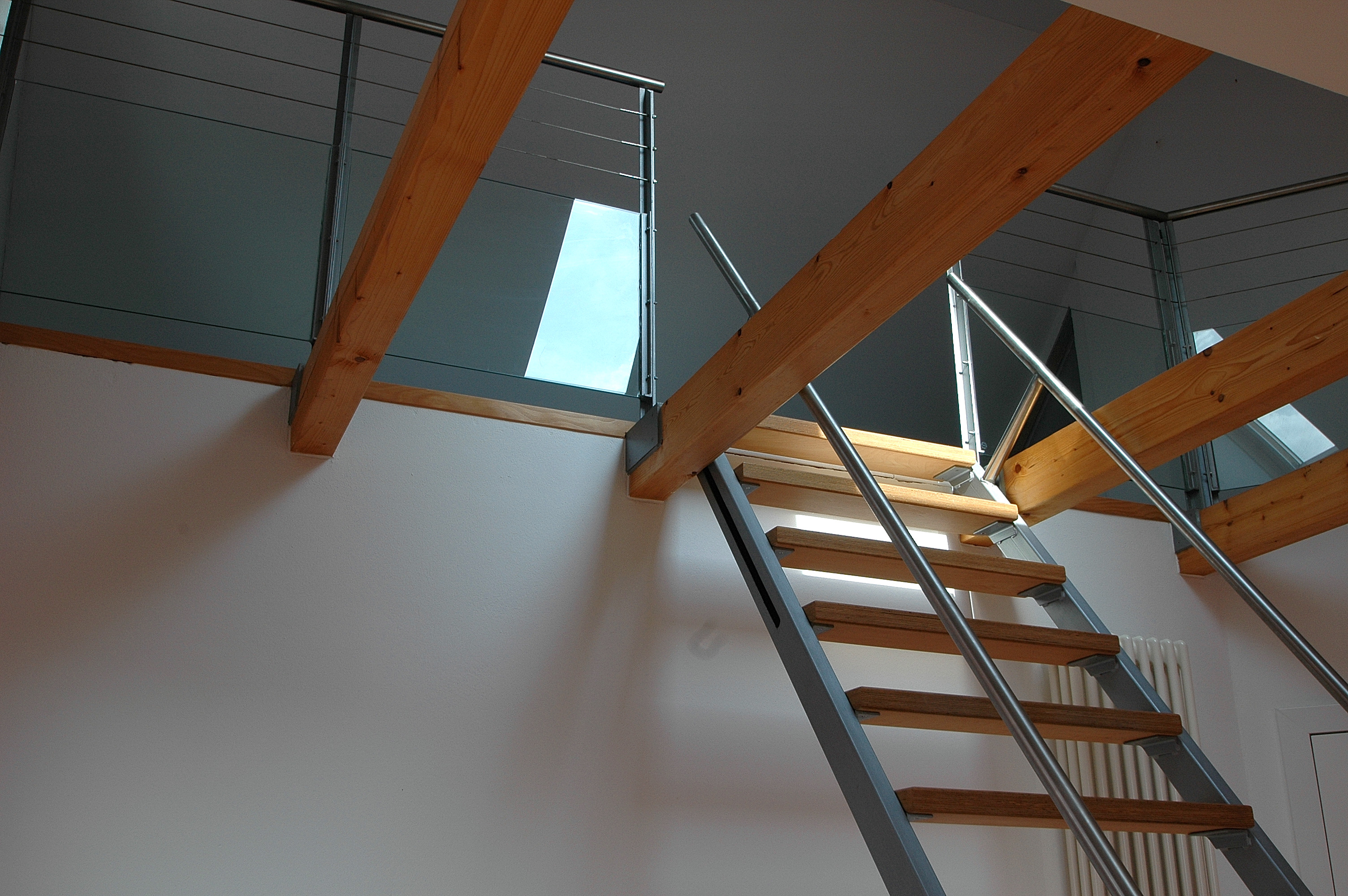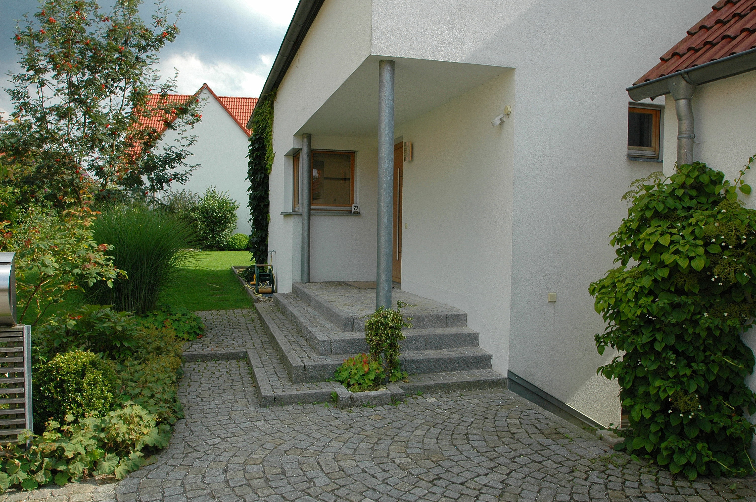 Dieses Einfamilienhaus wurde in einem Gebiet mit strengem Bebauungsplan gebaut. Da für dieses Haus bereits eine andere Planung von mir, für andere Bauherren existierte, bei der auch die Bodenplatte schon gegossen war, musste auf die vorhandenen Abmessungen Rücksicht genommen werden. Das Haus zeichnet sich durch seine klaren Grundriss und seine klaren Linien aus. Das Wohnzimmer ist nach Südwesten orientiert und in diese Richtung auch entsprechend aufgeglast.
