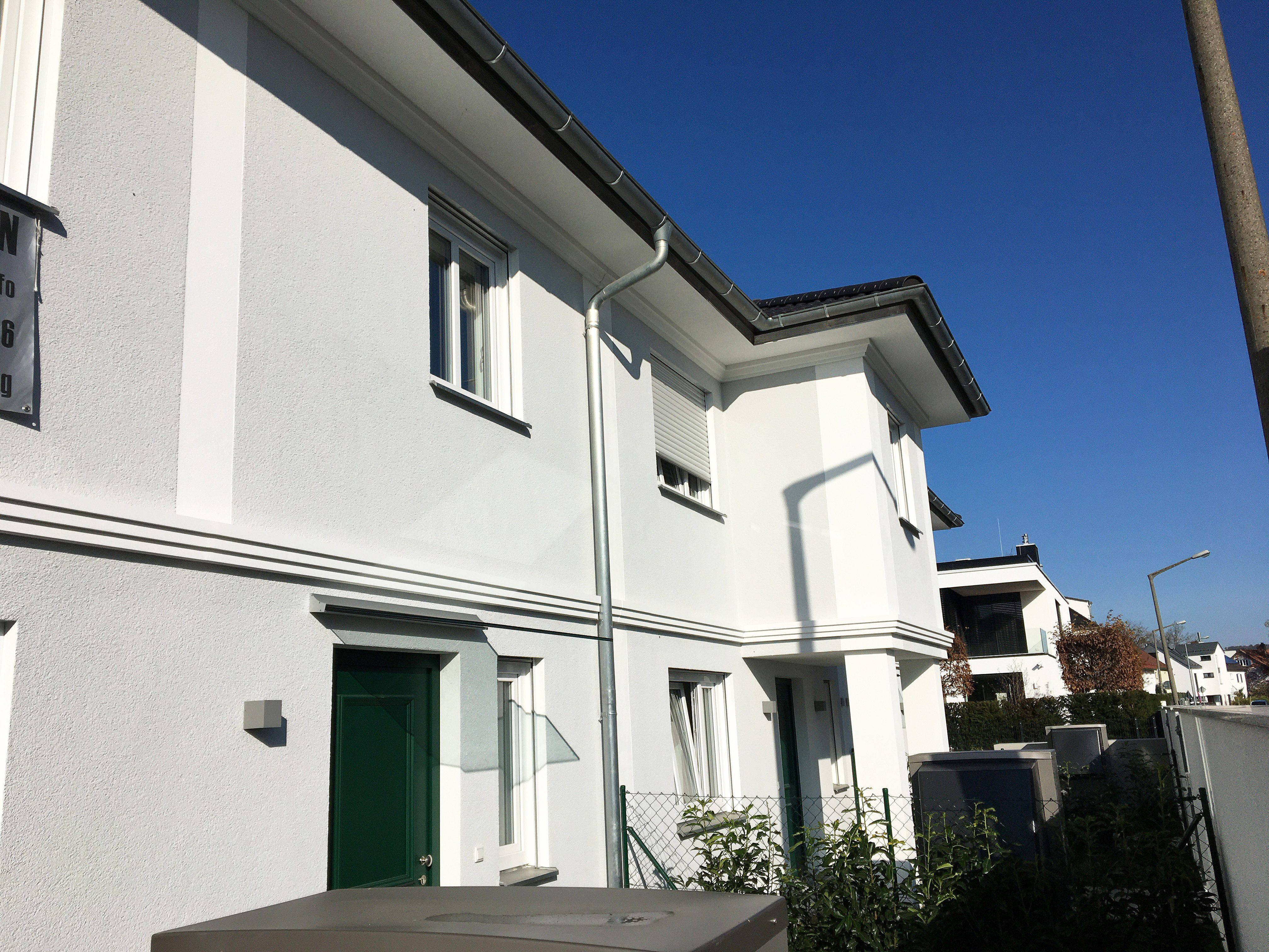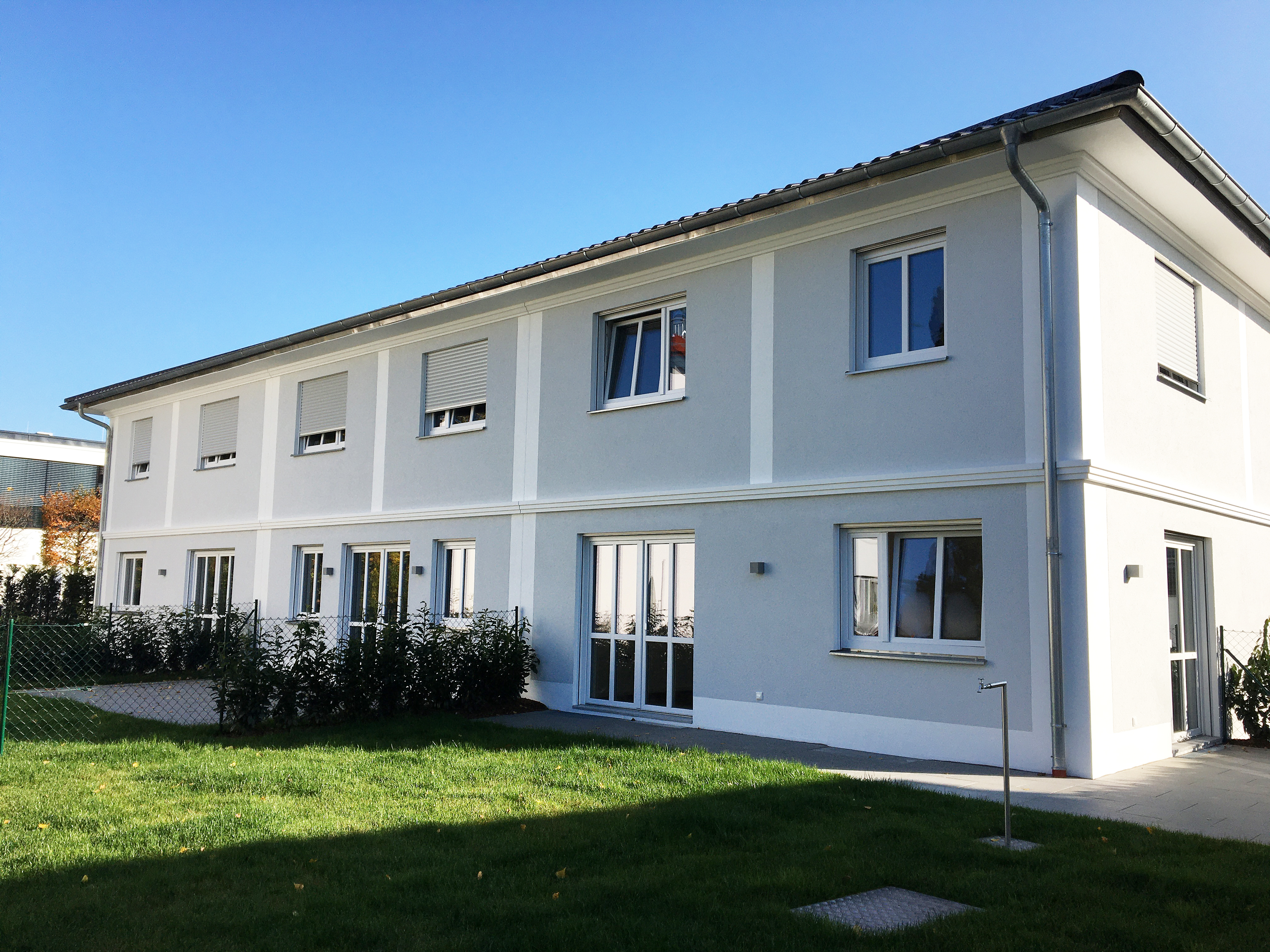 Das Grundstück in Stadtrandlage bot sich für die Bebauung mit drei Reihenhäusern an. Die Planung sollte auf Familien mit Kindern ausgerichtet werden, bei gleichzeitiger Optimierung auf die Grundstücksgröße und Vorgaben seitens der Genehmigungsbehörde. Die Strukturierung des Gebäudes erfolgt über Gesimse und Lisenen.