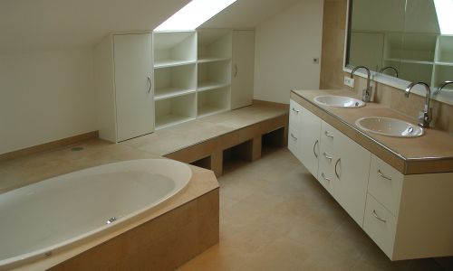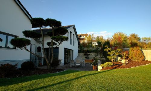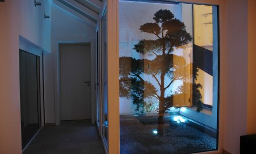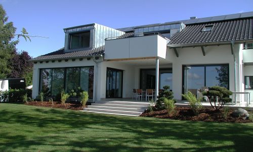 Bei diesem großzügigen Haus war ein Teil schon Bestand und ein weiterer Teil mit Schwimmbad sollte als Ersatz für die leerstehende Einliegerwohnung erstellt werden. Die Firsthöhe dieses Anbaus war daher die Massgabe für die neue Bebauung und die entsprechende Höhenentwicklung. Über einen Zwischenbau mit innenliegendem Lichthof wurde die Baumasse gegliedert und aufgehellt.