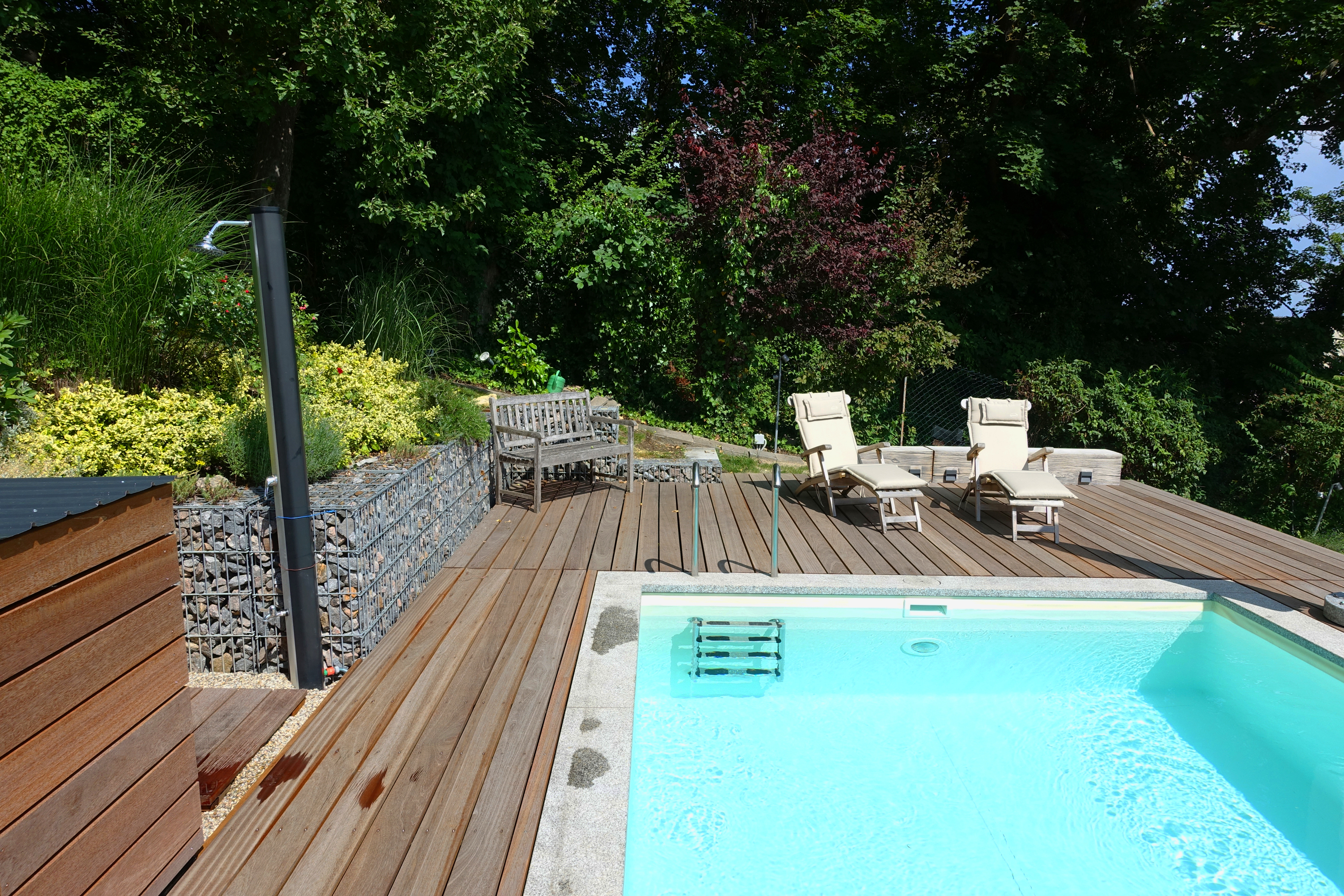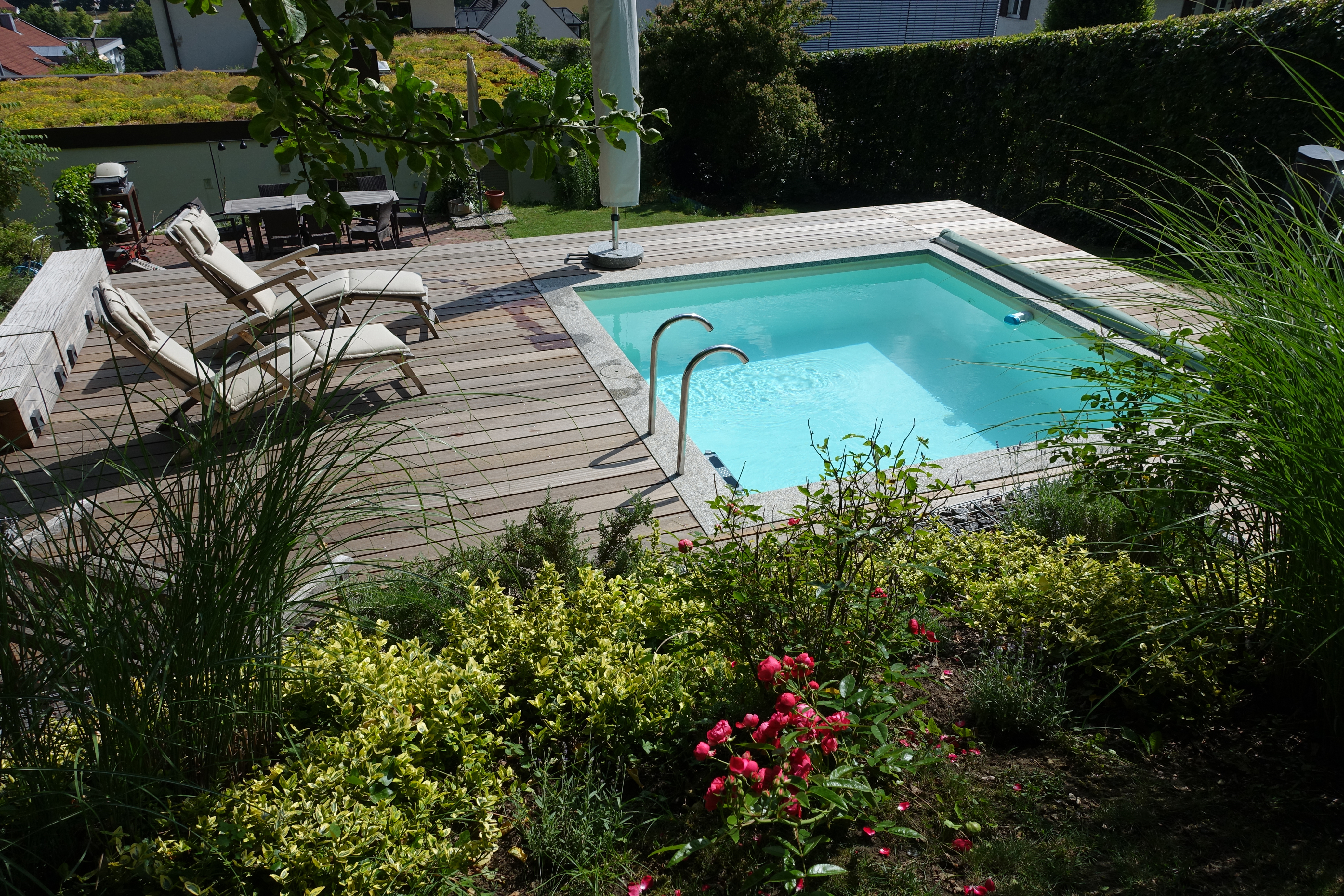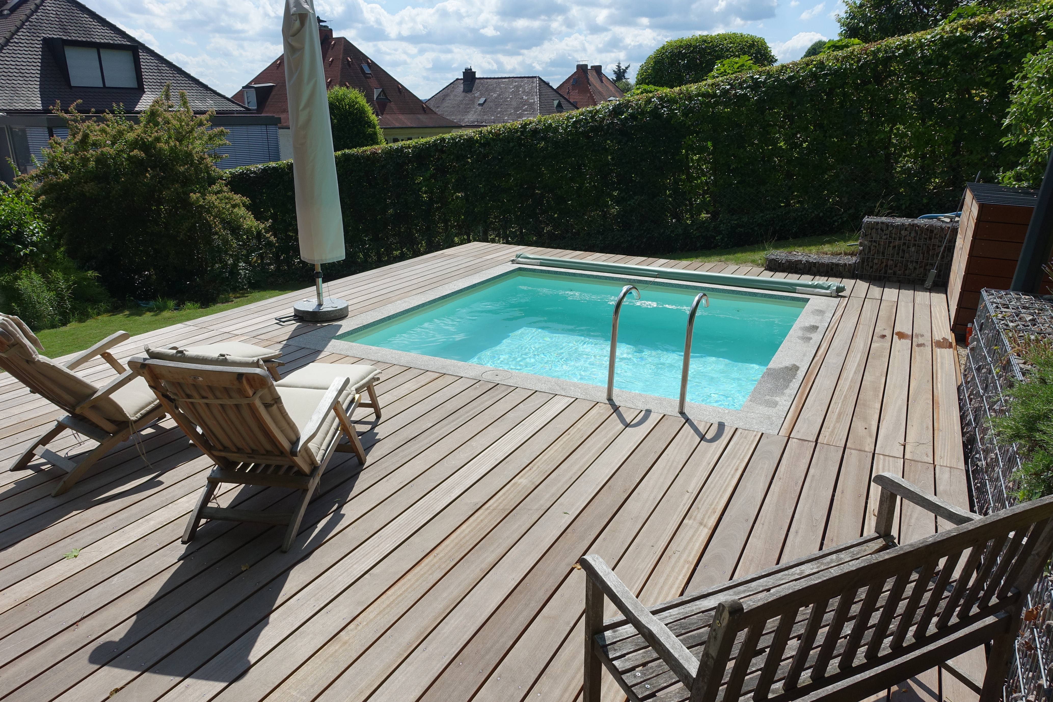 Der Aussenpool mit umlaufendem Holzdeck aus Eichendielen wurde in ein schmales Gartengrundstück an einem Südhang mit herrlicher Aussicht über Regensburg geplant und gebaut. Die Schwierigkeit hier bestand in der schlechten Zugänglichkeit zum Grundstück während der Bauphase. Durch die sandfarbene Folienauskleidung des Beckens, schimmert das Wasser türkisblau und lässt das Baden wie Urlaub erscheinen.